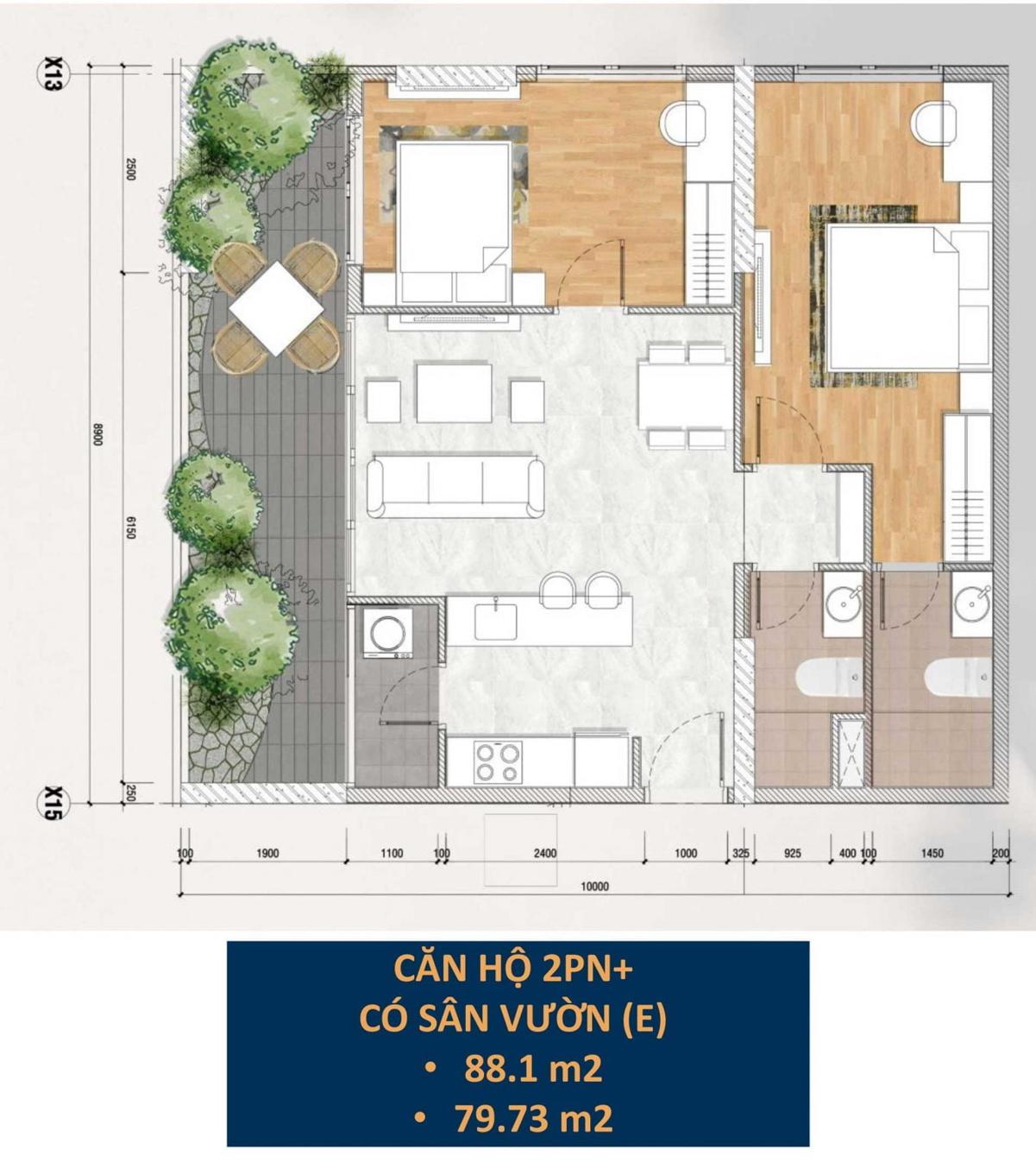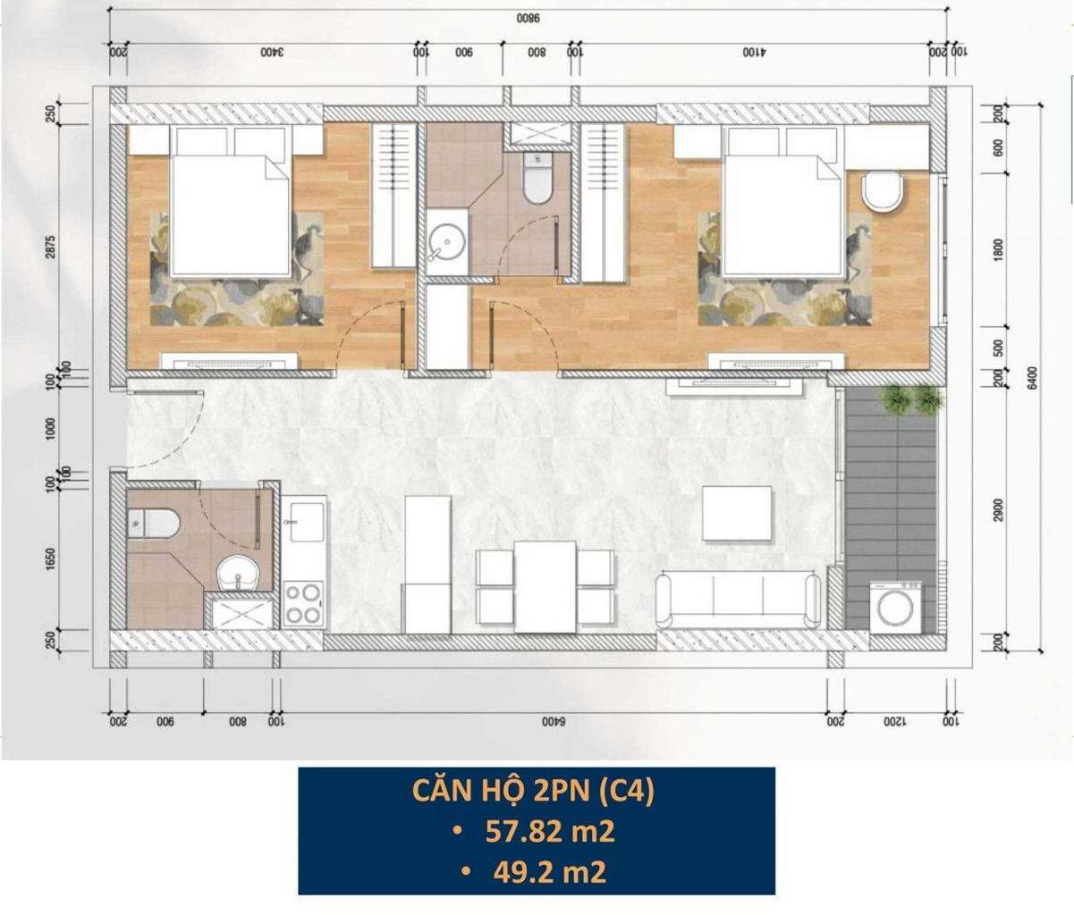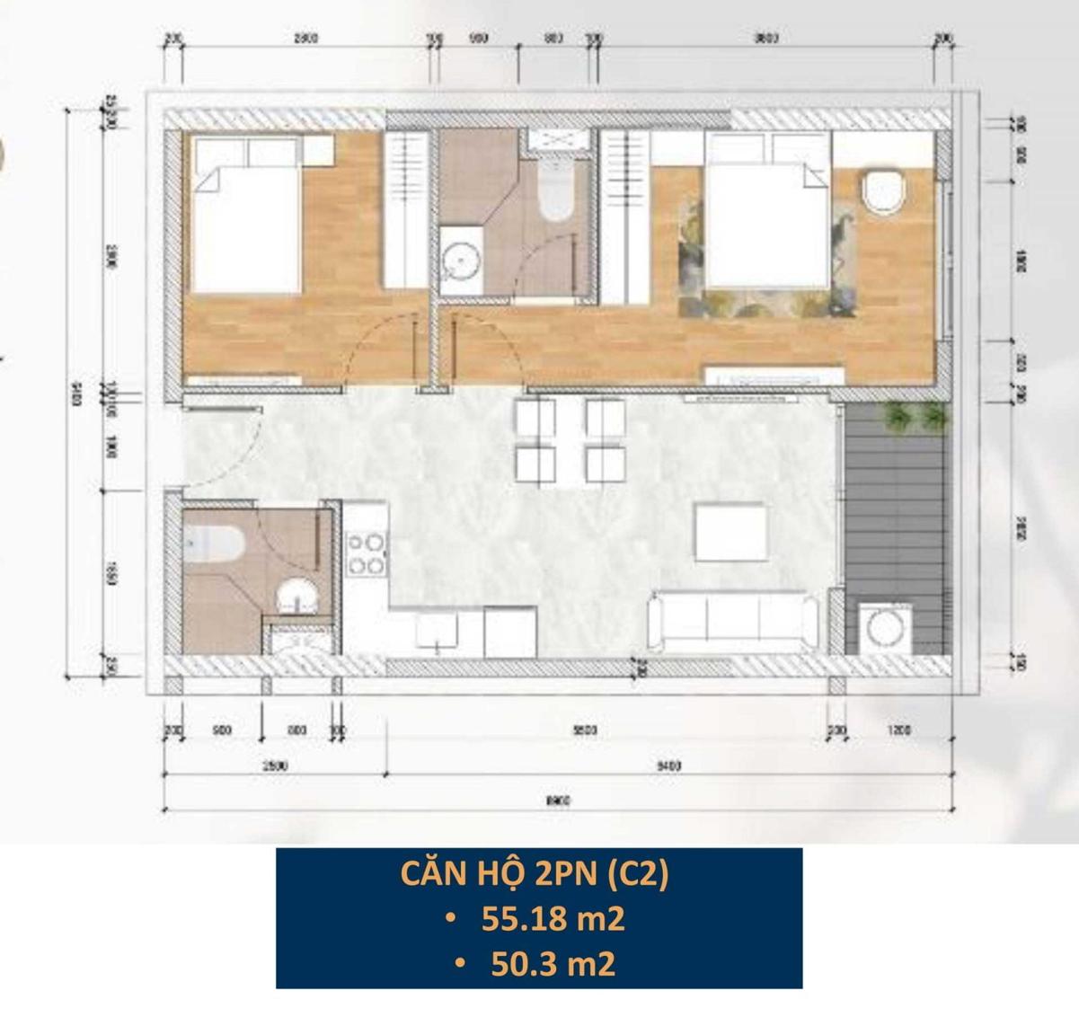 - 2 phòng ngủ: 55m2 – 60m2 – 71m2