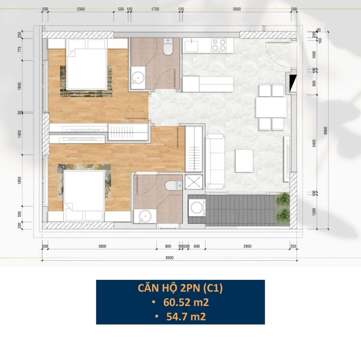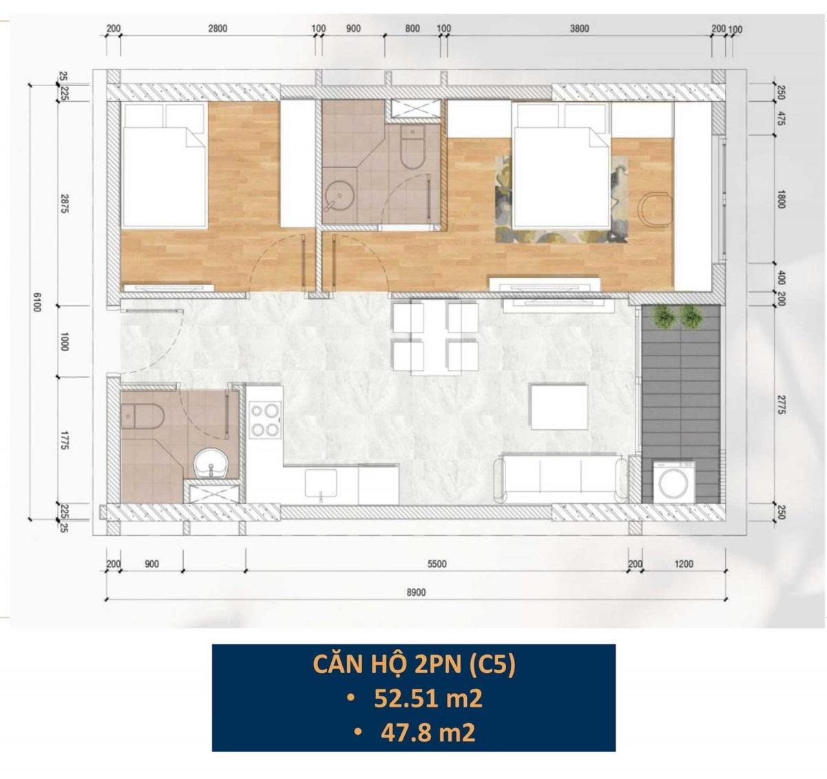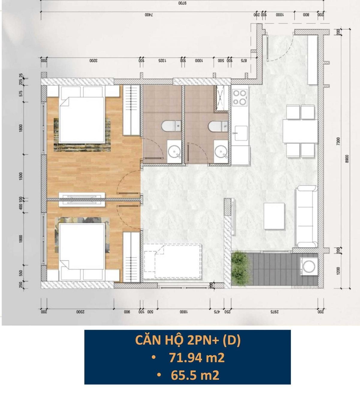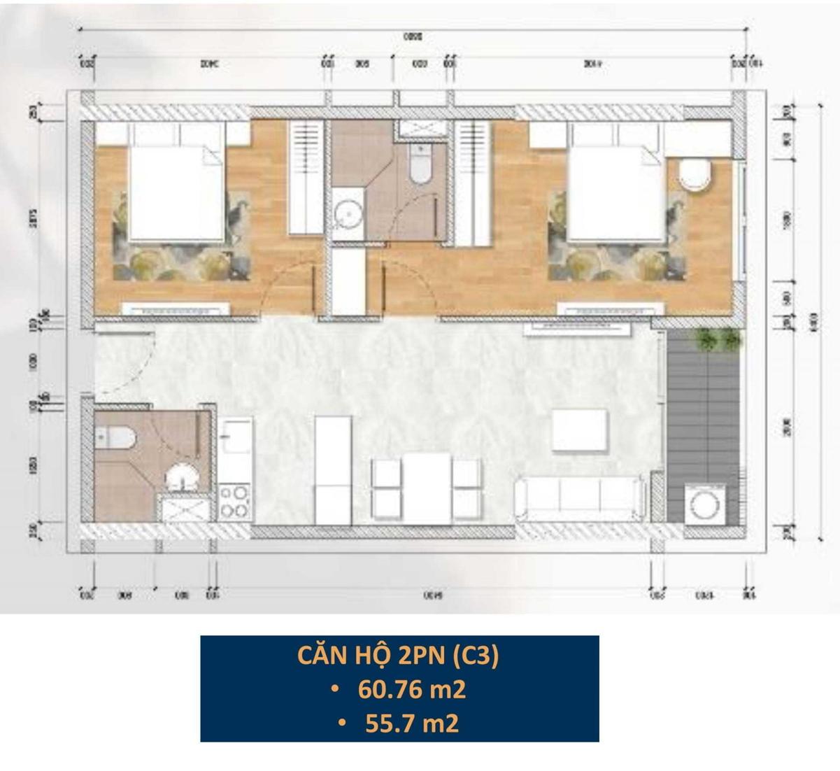 - 2 phòng ngủ: 55m2 – 60m2 – 71m2